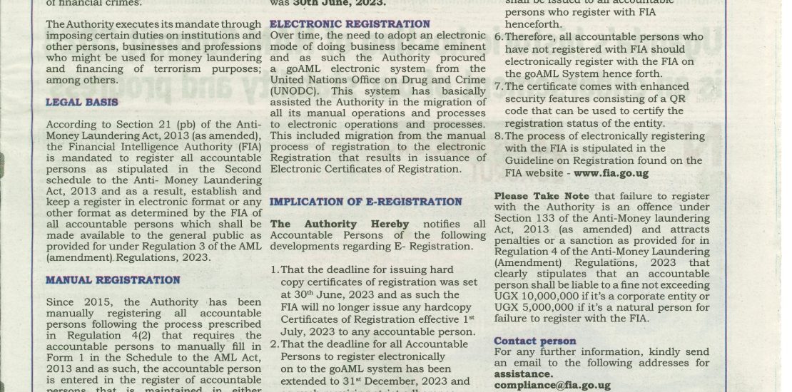 NOTIFICATION TO ALL ACCOUNTABLE PERSONS ON ELECTRONIC REGISTRATION WITH THE FINANCIAL INTELLIGENCE AUTHORITY (FIA) IN ACCORDANCE WITH REGULATION 4 OF THE ANTI-MONEY LAUNDERING (AMENDMENT) REGULATIONS, 2023